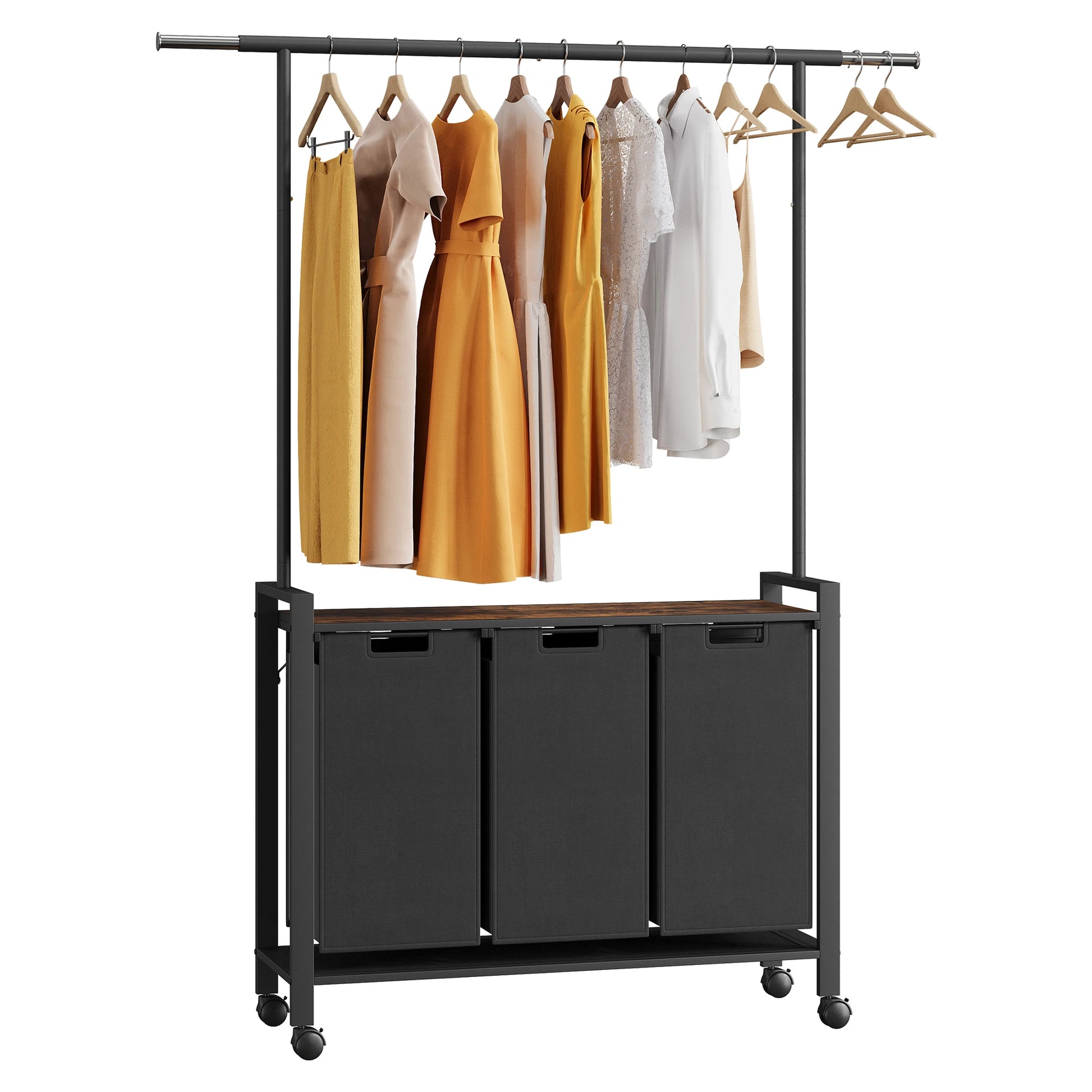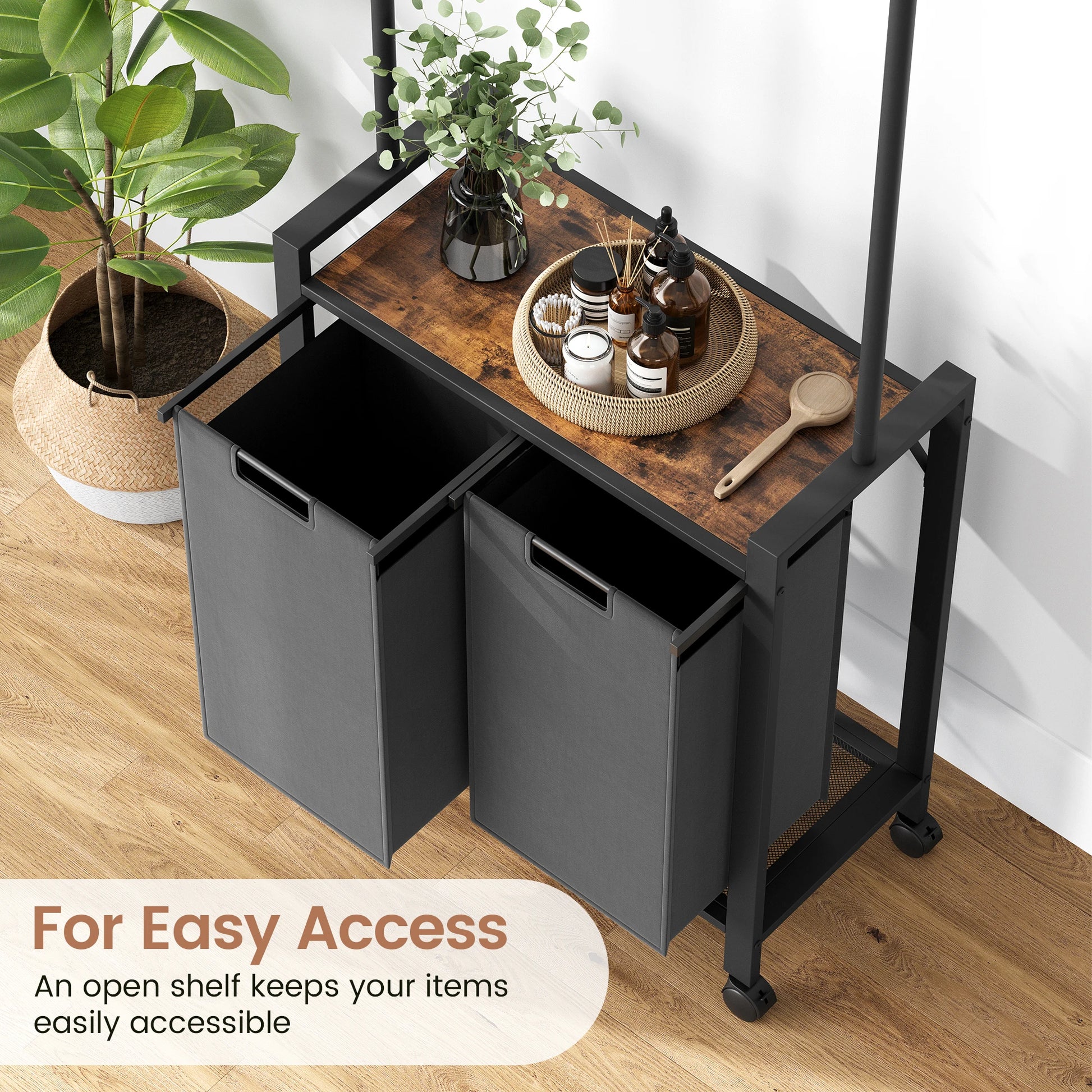 HobbyLane Laundry Hamper Sorter With Clothes Hanging Rod And Wooden Storage Shelf Organizer